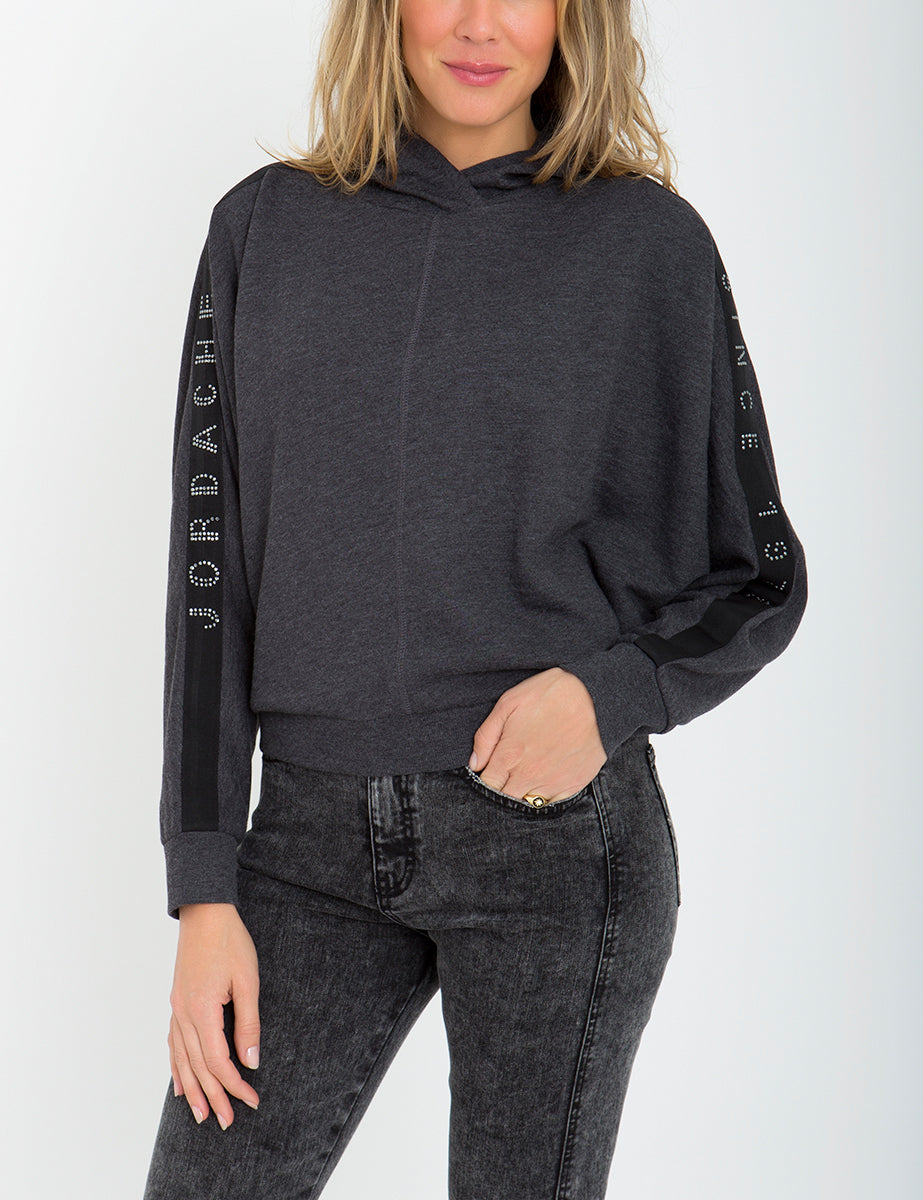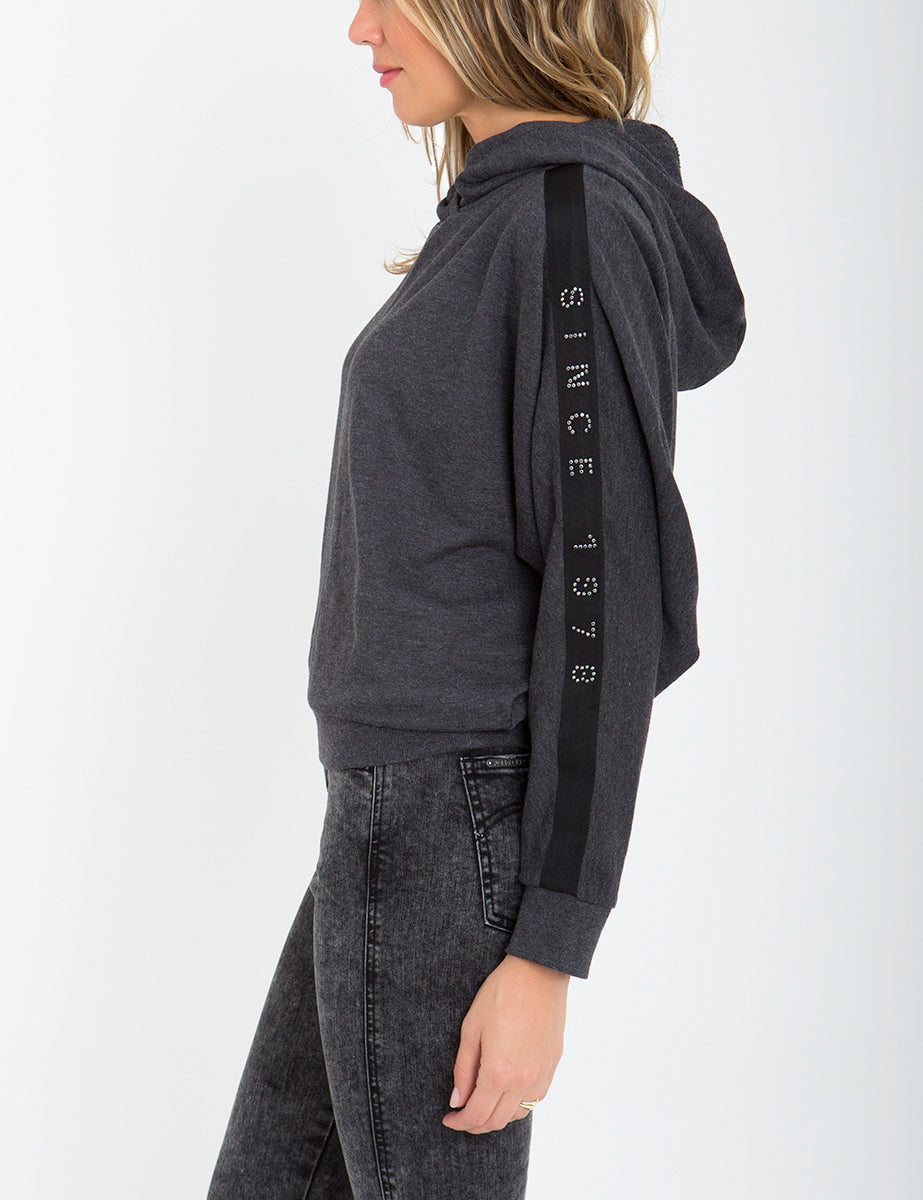The coziest sweatshirt in the coolest silhouette, this hoodie features bedazzled and branded taping down the sleeves for a signature look.