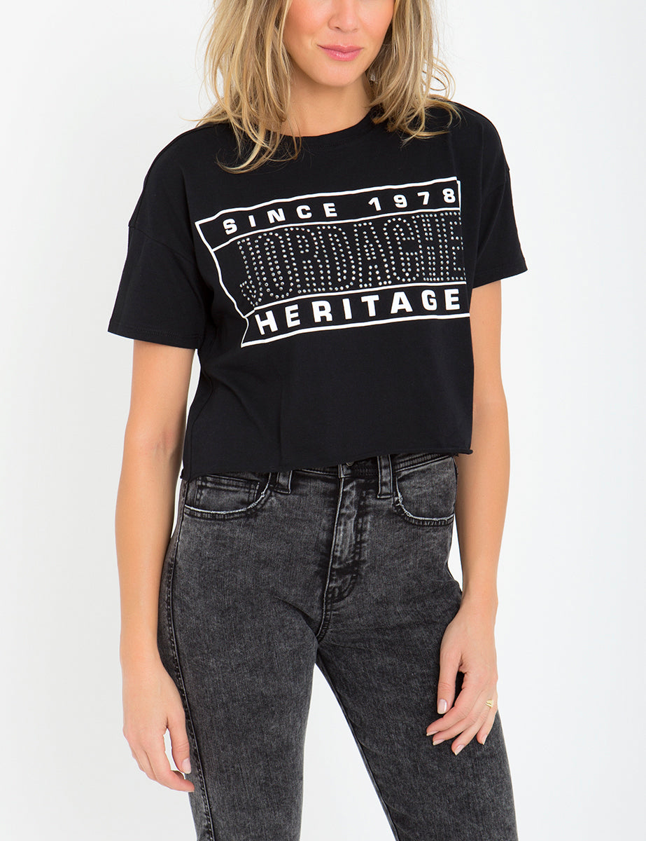 Comfortable and cool, this bedazzled and branded cotton tee boasts a slight slouch and a cropped silhouette.