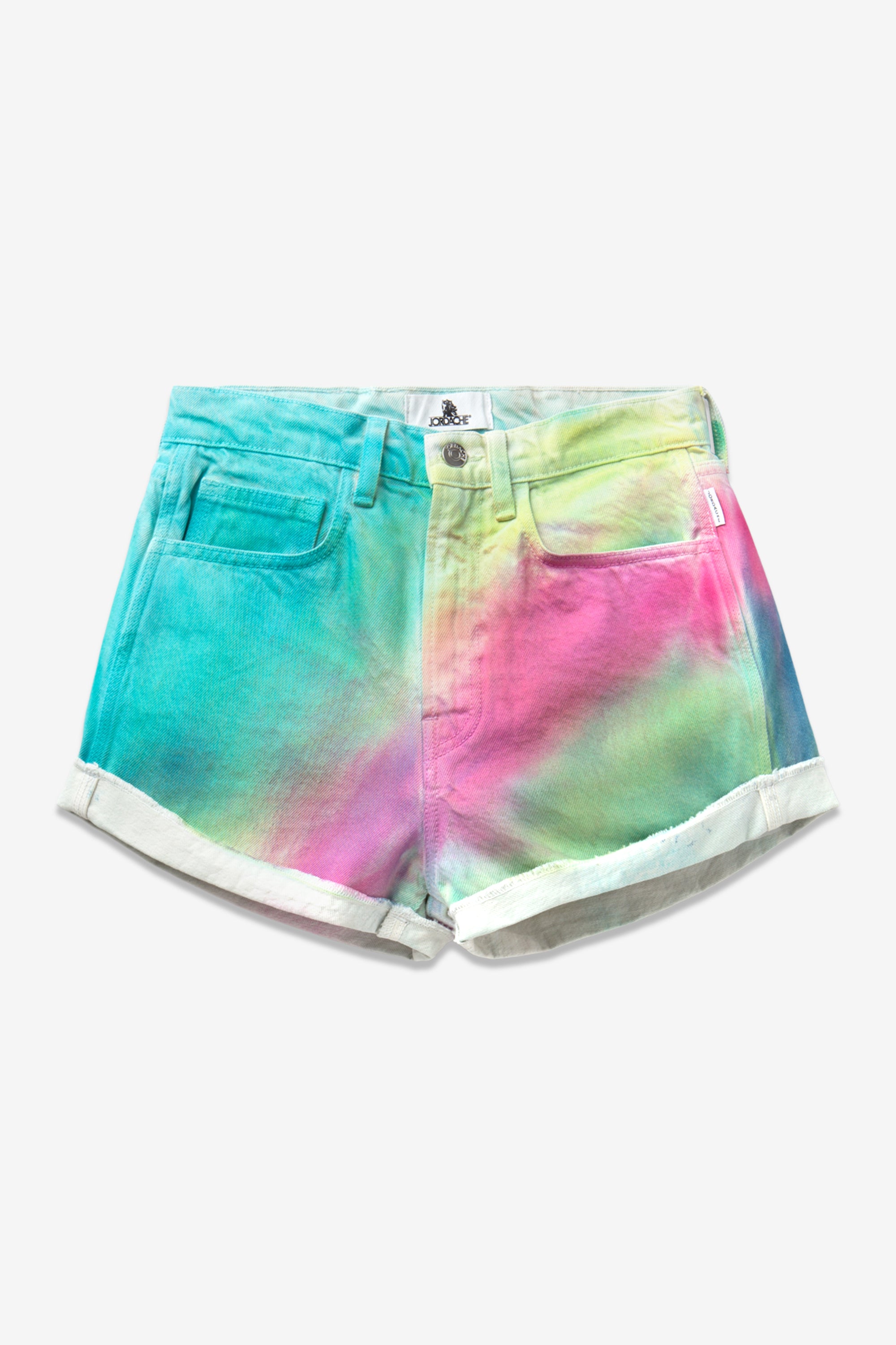 Vibrant, rainbow tie-dye high rise shorts fit like a dream and give vacation vibes like only we can deliver.