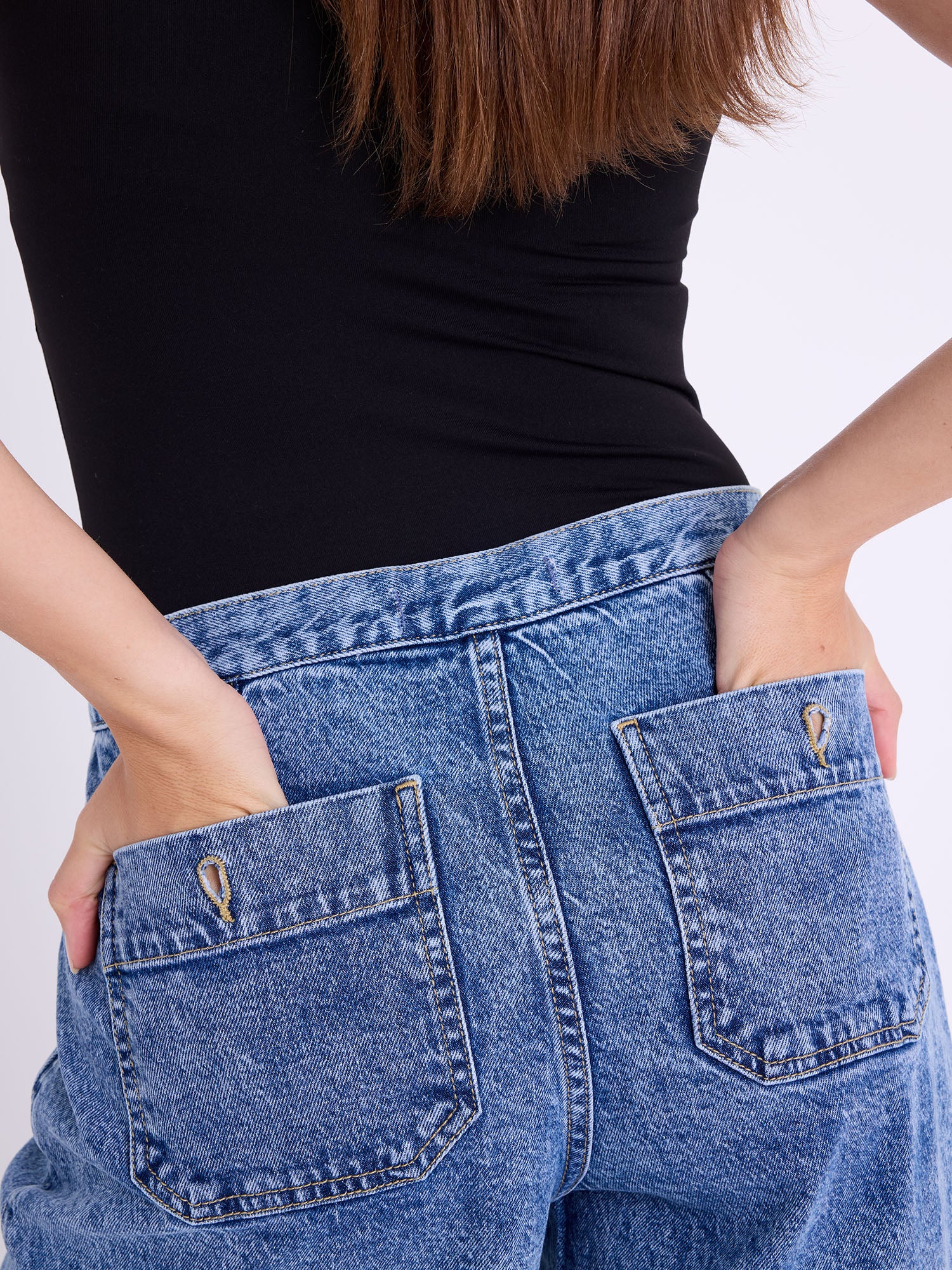 Slant hip pockets and patch back pockets