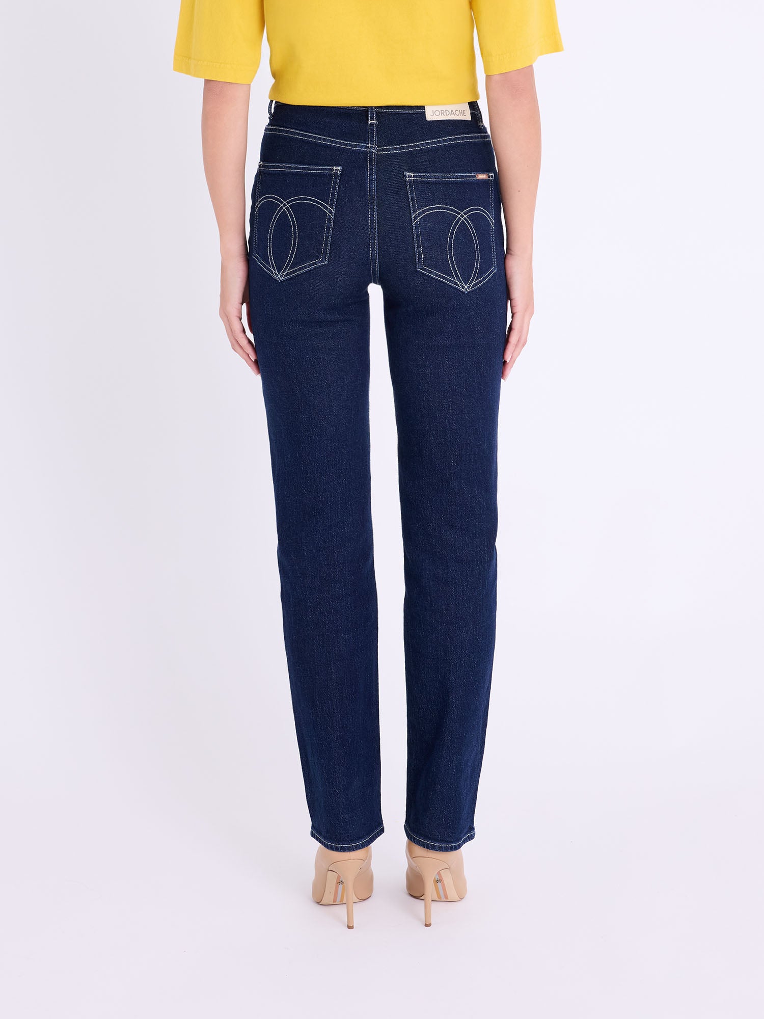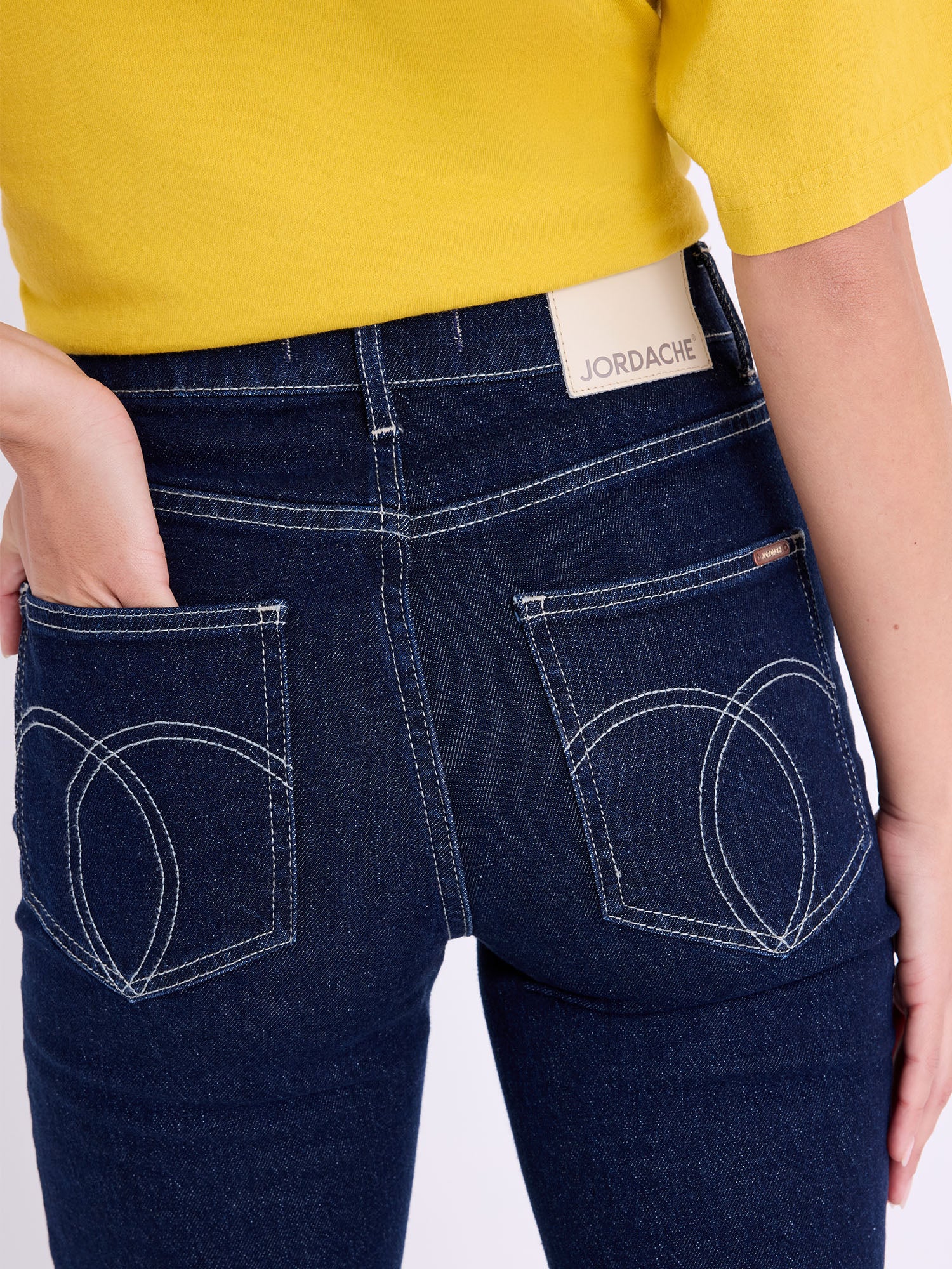 1978 High Rise Stove Pipe – a true heritage silhouette with tailored lines, Omega embroidery, and rigid Indigo Mosaic Jacquard inspired by Japanese “Boro” weaving.