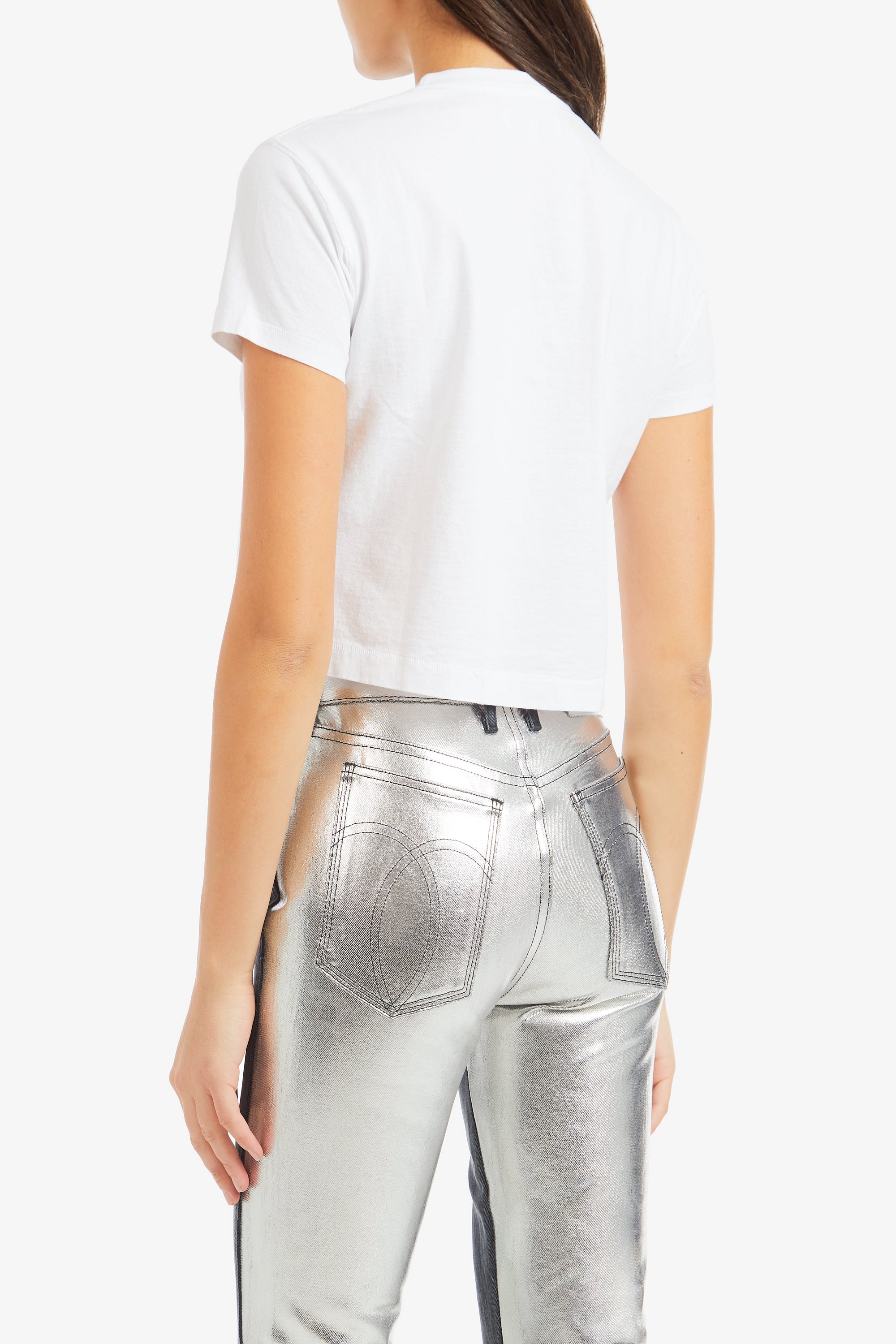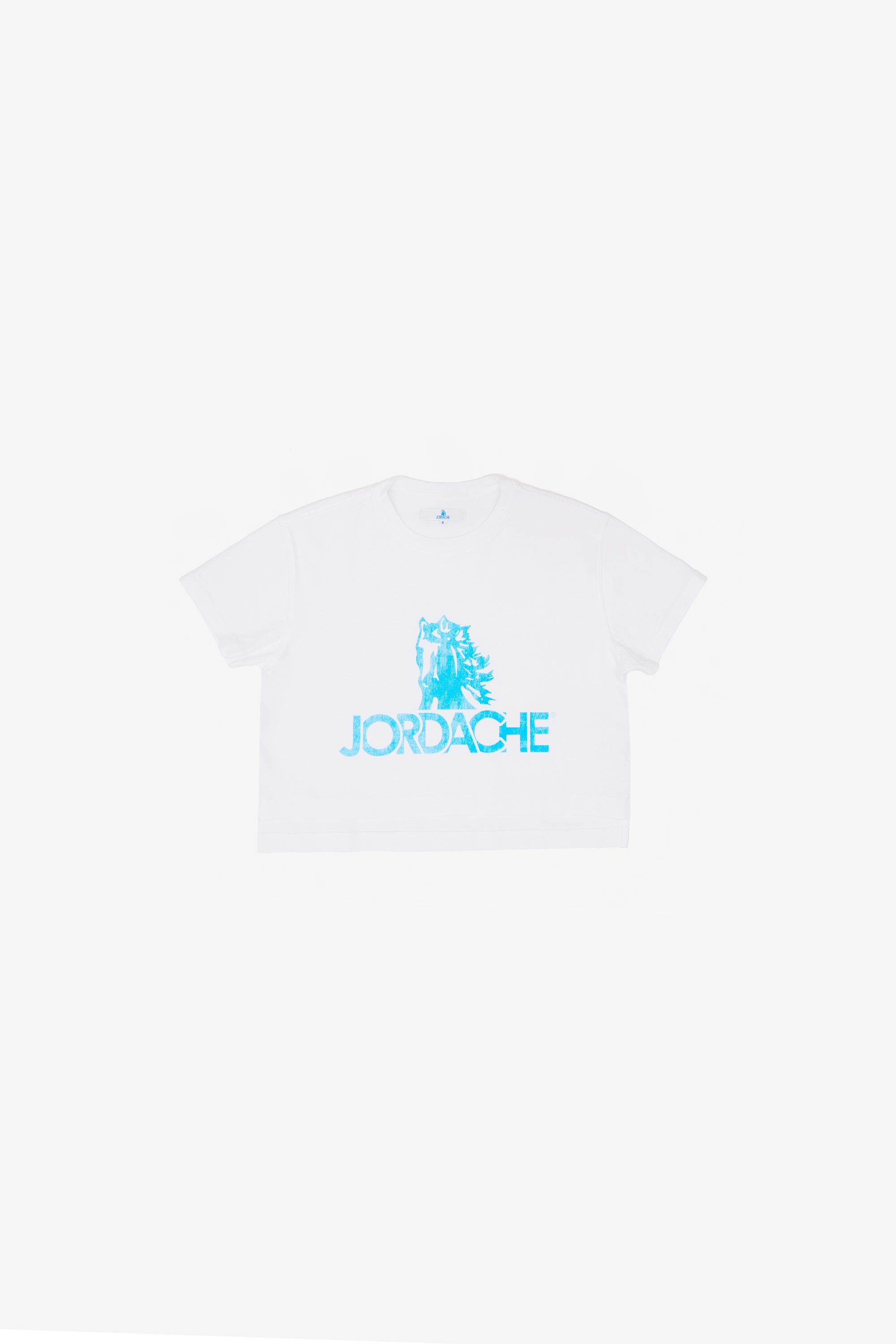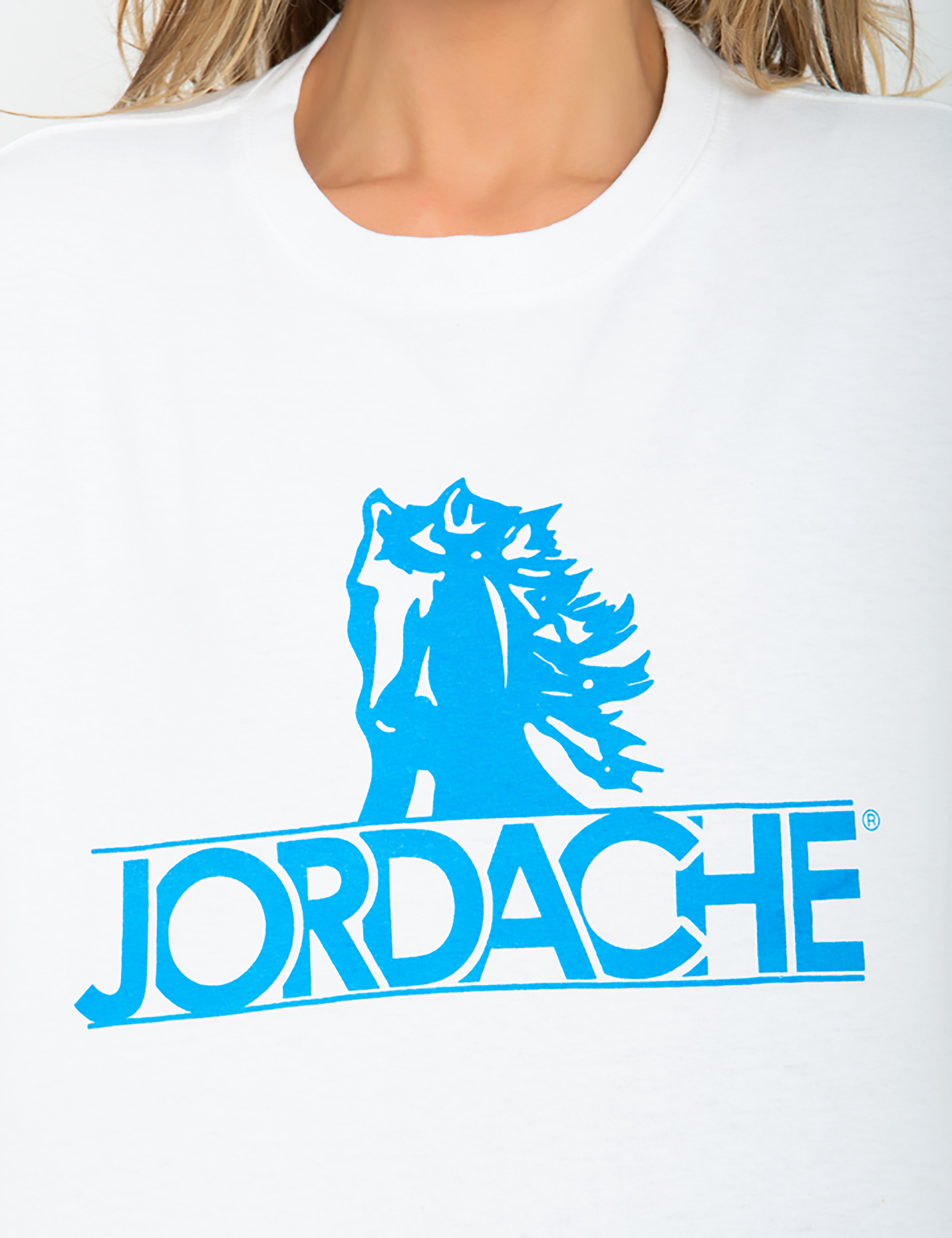 DESCRIPTION: Cropped T-Shirt with Blue Plastisol Jordache Logo Print