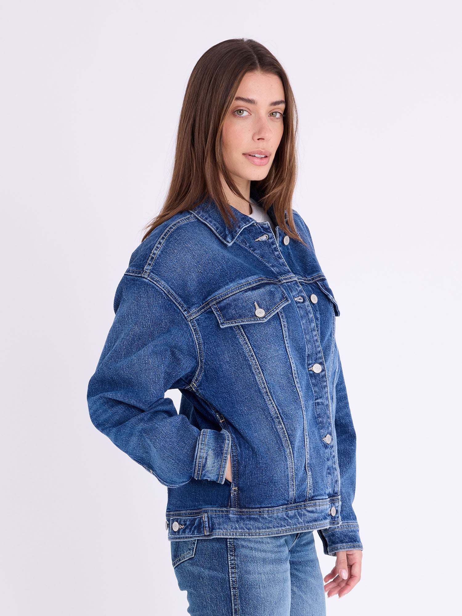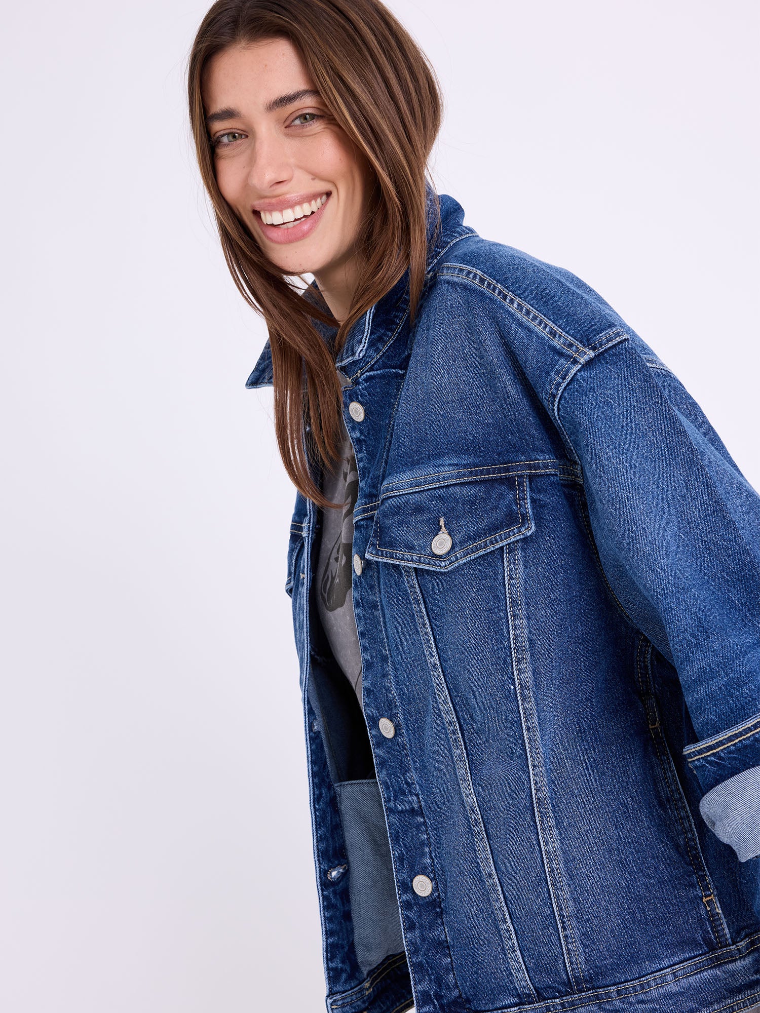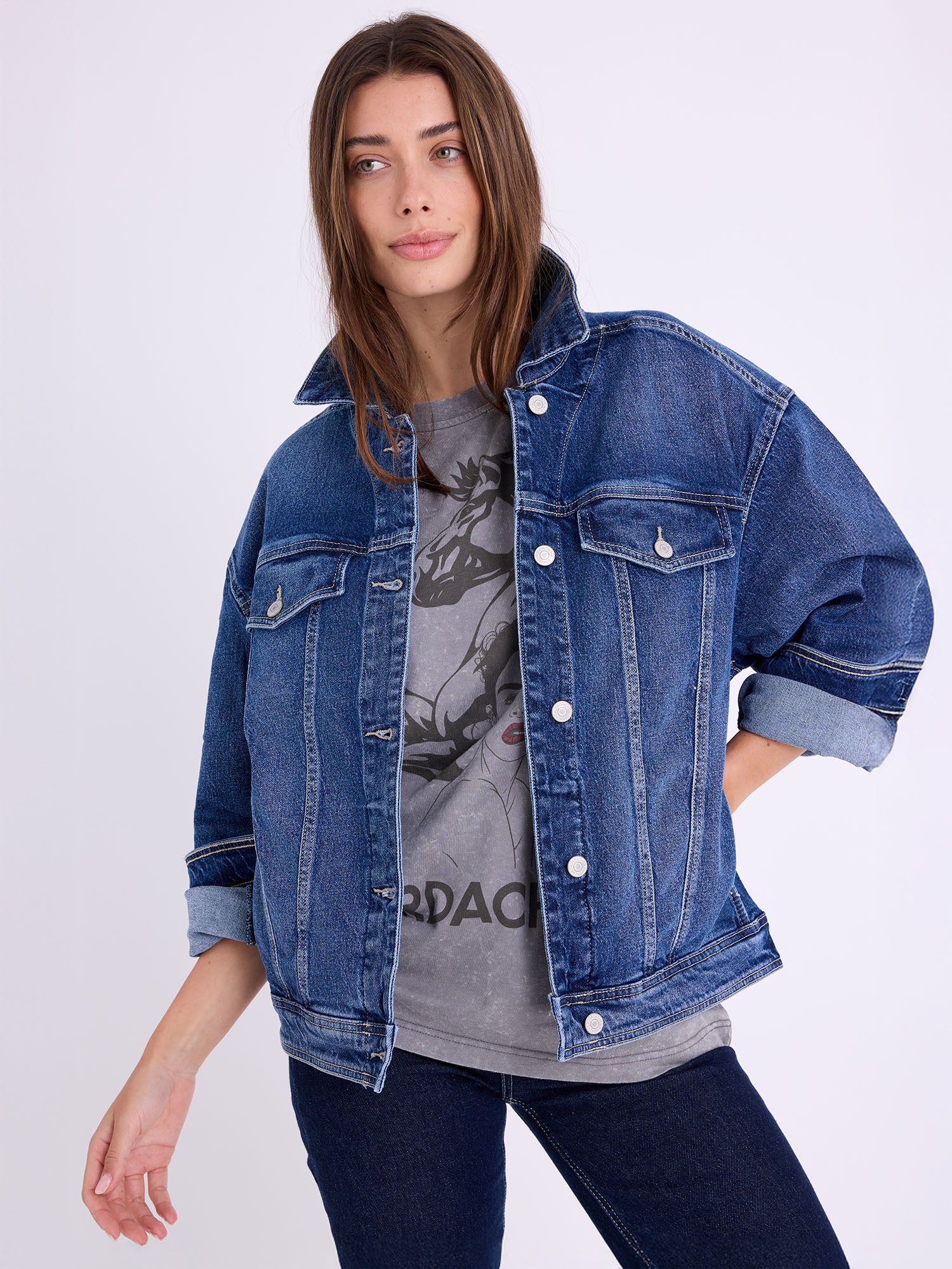 Kimmie Oversized Jacket – a relaxed layering piece in True Vintage Wash, nodding to classic Jordache outerwear. Pairs with Brooke High Rise Straight in True Vintage Wash.
