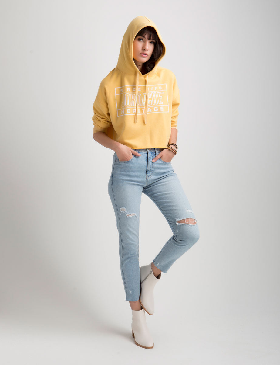 A raw-edge cropped hem ups the cool factor of a cotton-blend hoodie printed with strong logo branding.
