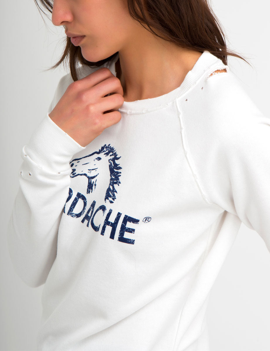 With a vintage-inspired graphic and holes at the neckline and sleeves, this logo graphic sweatshirt from Jordache has a lived-in, well-loved look.