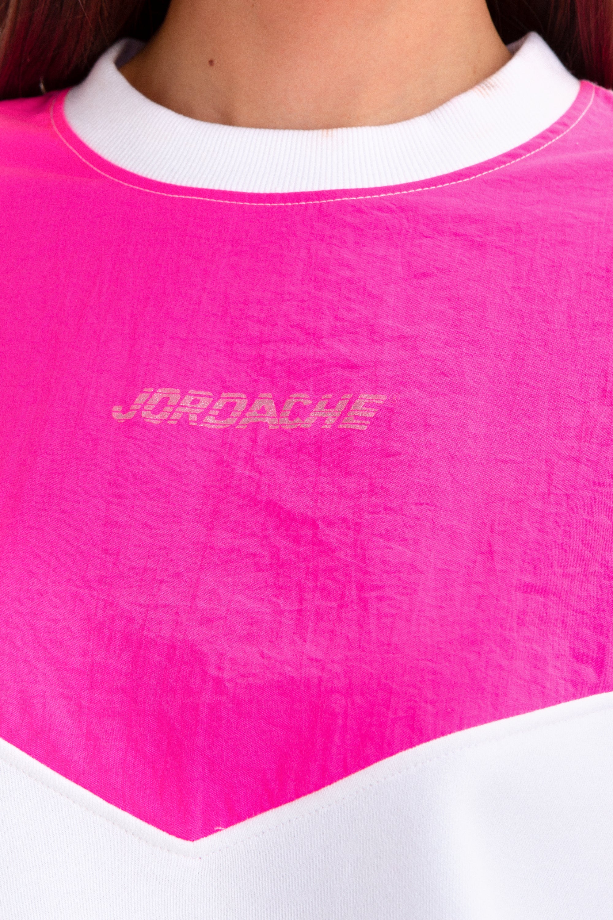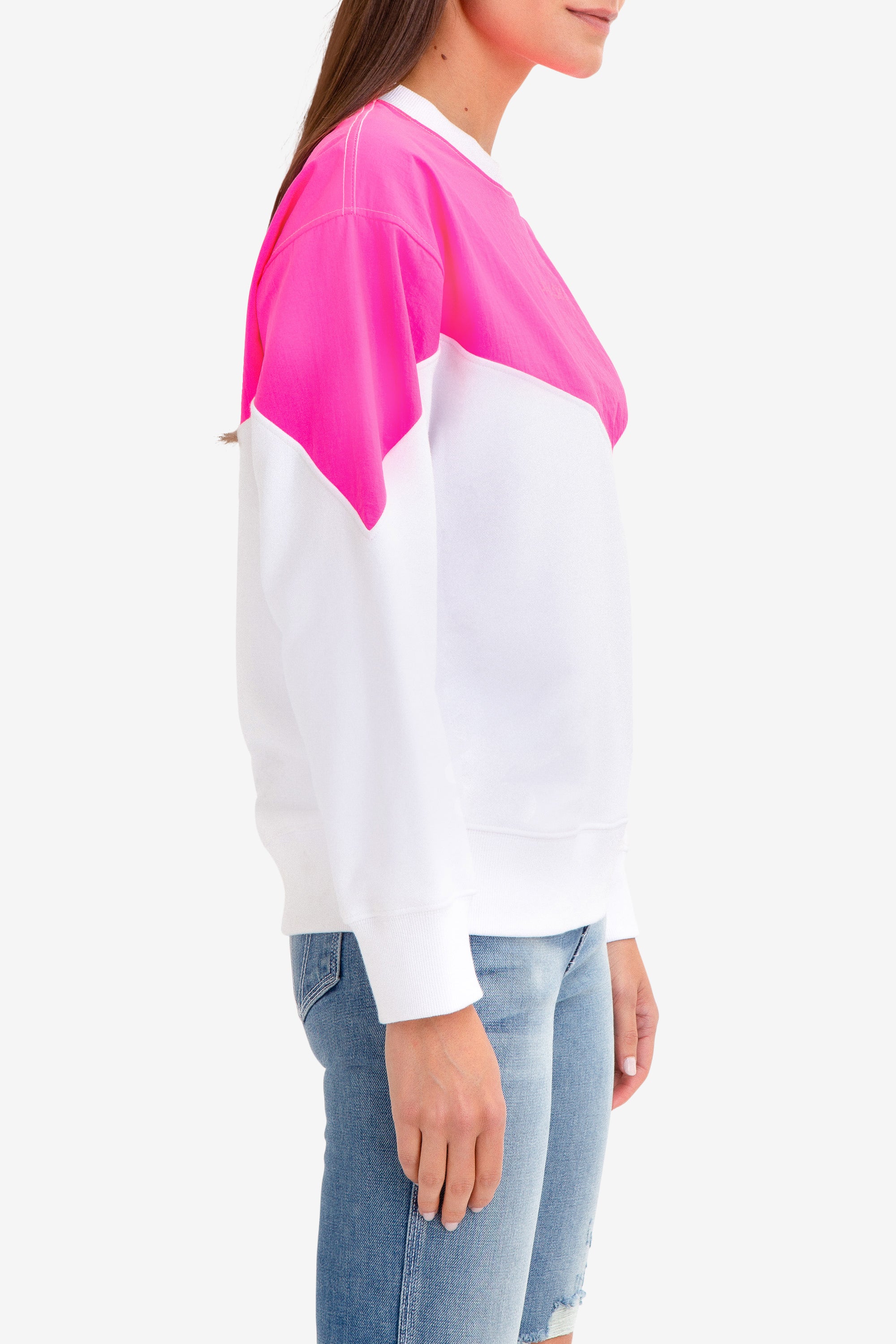 Inspired by a vintage ski sweater, this oversized sweatshirt pieces pink contrast fabric into our classic oversized sweatshirt, leaving the collar and bottom body in soft, comfy white fabric.