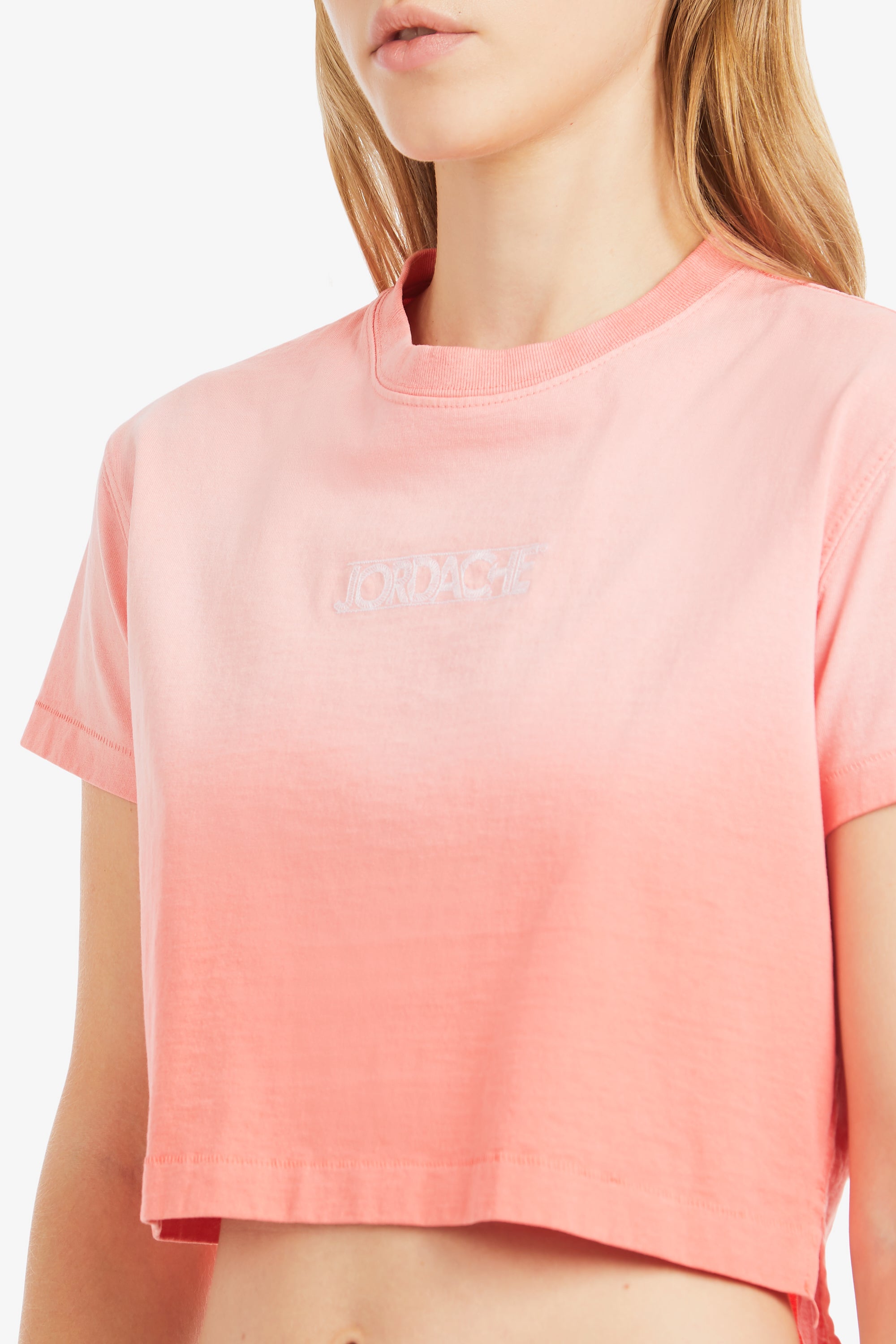This cropped t-shirt is embroidered with a custom open stitch Jordache logo and ombre dyed orange to feel like an authentic sunfade.